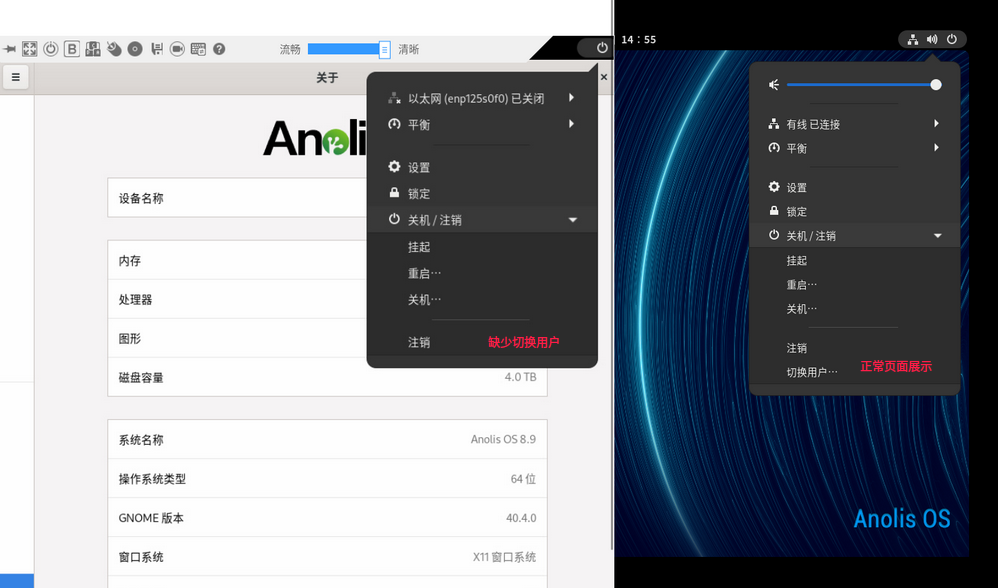 [Anolis8.9][RC1][Gnome][aarch64][x86_64]系统安装选择server,组件不选择dde安装,电源模块缺少切换用户选项