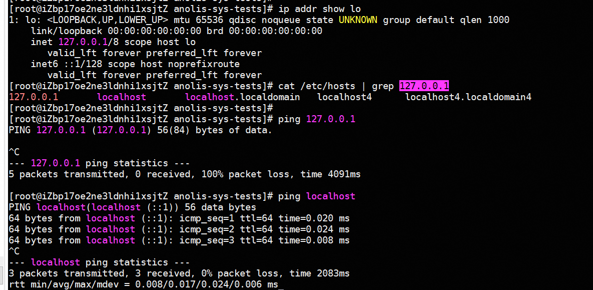 [问题描述]: Anolis23.2环境,执行ping 127.0.0.1失败 [环境信息]: 机器类型:ECS [内核信息]: uname -r 6.6.25-2.2_rc1.an23.x86_64 [操作系统信息]: cat /etc/os-release NAME="Anolis OS" VERSION="23.1" ID="anolis" VERSION_ID="23.1" PLATFORM_ID="platform:an23" PRETTY_NAME="Anolis OS 23.1" ANSI_COLOR="0;31" HOME_URL="https://openanolis.cn/" BUG_REPORT_URL="https://bugzilla.openanolis.cn/" [重现步骤]: 前置条件: N/A 测试步骤: - 执行ping 127.0.0.1 期望结果: - 执行ping 127.0.0.1成功 实际执行结果: 执行ping 127.0.0.1失败 1.执行ping localhost是成功的 2.有lo [root@iZbp17oe2ne3ldnhi1xsjtZ anolis-sys-tests]# ip addr 1: lo: <LOOPBACK,UP,LOWER_UP> mtu 65536 qdisc noqueue state UNKNOWN group default qlen 1000 link/loopback 00:00:00:00:00:00 brd 00:00:00:00:00:00 inet 127.0.0.1/8 scope host lo valid_lft forever preferred_lft forever inet6 ::1/128 scope host noprefixroute valid_lft forever preferred_lft forever 3. /etc/hosts里有127.0.0.1 localhost配置 [root@iZbp17oe2ne3ldnhi1xsjtZ anolis-sys-tests]# cat /etc/hosts # Loopback entries; do not change. # For historical reasons, localhost precedes localhost.localdomain: 127.0.0.1 localhost localhost.localdomain localhost4 localhost4.localdomain4 ::1 localhost localhost.localdomain localhost6 localhost6.localdomain6 4. 检查系统参数icmp_echo_ignore_all [root@iZbp17oe2ne3ldnhi1xsjtZ anolis-sys-tests]# cat /proc/sys/net/ipv4/icmp_echo_ignore_all 0 5. iptables配置 [root@iZbp17oe2ne3ldnhi1xsjtZ anolis-sys-tests]# iptables -L -v -n # Warning: iptables-legacy tables present, use iptables-legacy to see them Chain INPUT (policy ACCEPT 0 packets, 0 bytes) pkts bytes target prot opt in out source destination Chain FORWARD (policy ACCEPT 0 packets, 0 bytes) pkts bytes target prot opt in out source destination Chain OUTPUT (policy ACCEPT 0 packets, 0 bytes) pkts bytes target prot opt in out source destination 6. getenforce [root@iZbp17oe2ne3ldnhi1xsjtZ anolis-sys-tests]# getenforce Permissive 7. /etc/resolv.conf的配置和正常的机器也没区别