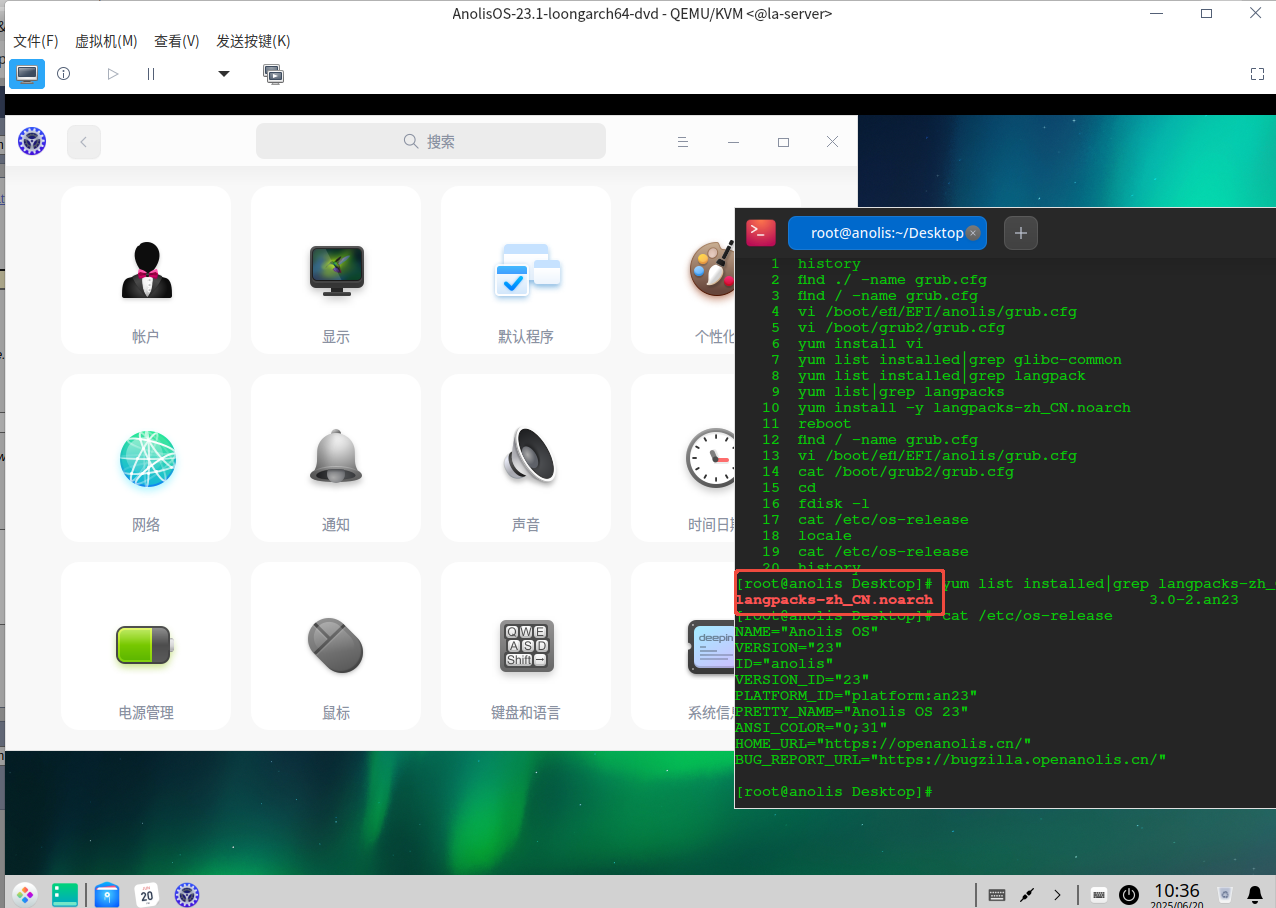 【问题描述】 界面语言选择中文,安装启动DDE桌面后,界面显示为英文 软件版本】 1、系统版本:Anolis OS release 23.2 2、内核版本:6.6.52-2.3_rc1.an23.loongarch64 【iso下载】 https://build.openanolis.cn/kojifiles/output/anolis-23-20241130.1/compose/os/loongarch64/iso/anolis-23-loongarch64-dvd1-20241130.1.iso 【复现步骤】 1、dd刻录U盘启动盘,在bios中选择U盘启动 2、在语言部分选择为汉语 3、在软件选择模块选择带DDE桌面的服务器,并安装启动系统 【实际结果】 DDE桌面安装启动后界面显示为英文 【期望结果】 当语言选择为中文时,DDE桌面安装启动后界面为中文 当语言选择为英文时,DDE桌面安装启动后界面为英文