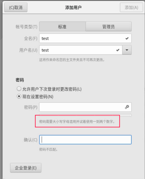 Created attachment 265 [details] 密码设置.png 鲲鹏&Intel服务器GUI安装4.19(ANCK)内核,安装完成后进入系统添加用户,设置密码时仅输入小写字母也可以添加成功。 环境: 1.硬件(aarch64):鲲鹏服务器 cpu: HUAWEI Kunpeng 920 5220 内存:512G 硬盘:1.8T*4 硬件(x86_64):Intel服务器 cpu: Intel 5218 内存:512G 硬盘:8TB 2. 软件:https://mirrors.openanolis.cn/anolis/8.6/isos/BETA/aarch64/anolis-8.6-aarch64-dvd.iso 步骤: 1、使用鲲鹏&Intel服务器,选择语言为中文,安装4.19内核 2、安装完成后进入系统,点击活动-设置-详细信息-用户-添加用户 3、选择"现在设置密码",提示显示为“密码需要大小写字母混用...”,输入"uniontech" 实际结果: 仅输入小写字母也可以成功设置密码 期望结果: 与提示信息一直,需要大小写字母混用才能成功设置密码 详细信息见图片附件。