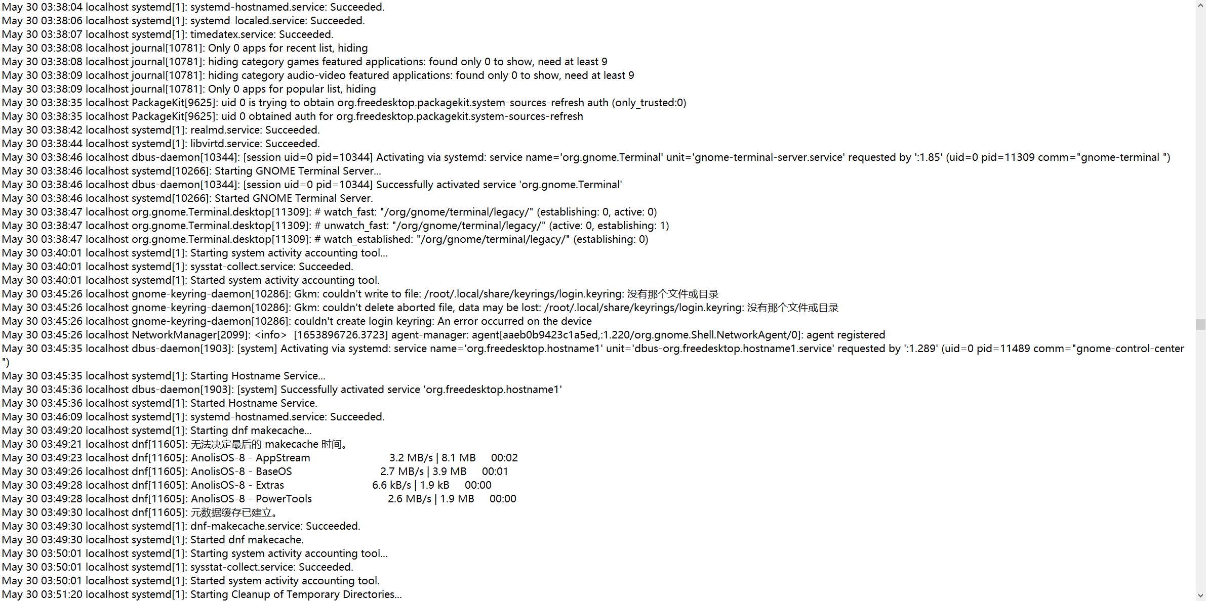 在日志中发现以下信息 May 31 14:02:30 localhost journal[4134]: failed to get edid: unable to get EDID for output May 31 14:02:30 localhost journal[3813]: Error looking up permission: GDBus.Error:org.freedesktop.portal.Error.NotFound: No entry for geolocation May 31 14:02:31 localhost NetworkManager[2002]: <info> [1653976951.2138] agent-manager: agent[55560d5747f36b93,:1.87/org.gnome.Shell.NetworkAgent/42]: agent registered May 31 14:02:31 localhost journal[4134]: unable to get EDID for xrandr-VGA-1: unable to get EDID for output