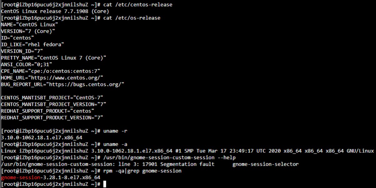 安装gnome-session-3.28.1-8.an7.x86_64包后 执行二进制文件/usr/bin/gnome-session-custom-session --help发生core dump [环境信息]: 内核信息: # uname -r 4.19.91-25.an7.x86_64 操作系统信息: # cat /etc/os-release NAME="Anolis OS" VERSION="7.9" ID="anolis" ID_LIKE="rhel fedora centos" VERSION_ID="7.9" PRETTY_NAME="Anolis OS 7.9" ANSI_COLOR="0;31" HOME_URL="https://openanolis.cn/" BUG_REPORT_URL="https://bugs.openanolis.cn/" CENTOS_MANTISBT_PROJECT="CentOS-7" CENTOS_MANTISBT_PROJECT_VERSION="7" REDHAT_SUPPORT_PRODUCT="centos" REDHAT_SUPPORT_PRODUCT_VERSION="7" [期望结果]: 执行包中全部二进制文件不会发生core dump [实际结果]: 执行二进制文件gnome-session-custom-session时发生core dump /usr/bin/gnome-session-custom-session --help /usr/bin/gnome-session-custom-session: line 3: 15790 Segmentation fault (core dumped) gnome-session-selector Terminated [问题发生概率]:必现 [复现步骤]: yum -y install gnome-session.x86_64 /usr/bin/gnome-session-custom-session --help