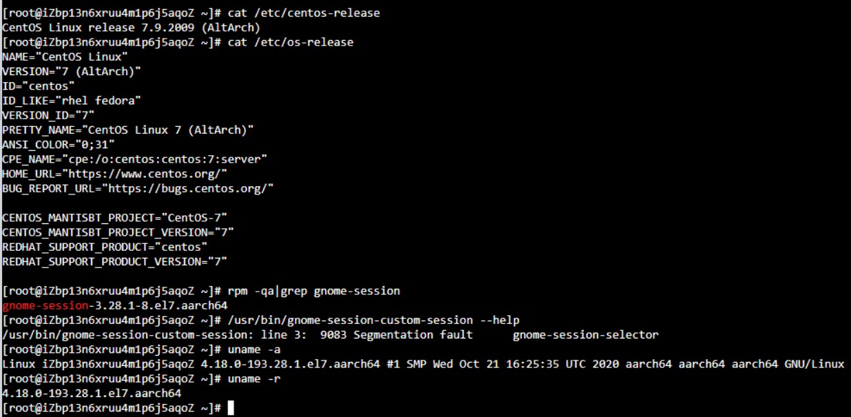 飞腾机器anolis 7.9 arm anck内核,gnome-session包测试遇到同样问题 /usr/bin/gnome-session-custom-session --help /usr/bin/gnome-session-custom-session: line 3: 10956 Segmentation fault (core dumped) gnome-session-selector Terminated # uname -r 4.19.91-25.an7.aarch64