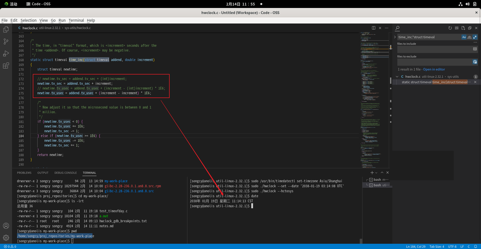 (In reply to xunlei from comment #4) 提单的问题场景 环境是 util-linux-2.32.1-43.0.1.an8.x86_64, [songcy@anolis ~]$ rpm -qf $(which hwclock) util-linux-2.32.1-43.0.1.an8.x86_64 [songcy@anolis ~]$ rpm -q util-linux util-linux-2.32.1-43.0.1.an8.x86_64 [songcy@anolis ~]$ 继续更新工具 util-linux 到最新版本, 问题复现, [songcy@anolis ~]$ yum --showduplicates list util-linux AnolisOS-8 - Extras 9.5 kB/s | 2.3 kB 00:00 Extra Packages for Enterprise Linux Modular 8 - x86_64 6.7 kB/s | 733 kB 01:49 已安装的软件包 util-linux.x86_64 2.32.1-43.0.1.an8 @anaconda 可安装的软件包 util-linux.x86_64 2.32.1-43.0.1.an8 BaseOS util-linux.x86_64 2.32.1-44.0.1.an8.1 BaseOS util-linux.x86_64 2.32.1-45.0.1.an8.1 BaseOS util-linux.x86_64 2.32.1-46.0.1.an8 BaseOS util-linux.x86_64 2.32.1-46.0.3.an8 BaseOS [songcy@anolis ~]$ [songcy@anolis ~]$ sudo yum install util-linux-2.32.1-46.0.3.an8 ... 已升级: libblkid-2.32.1-46.0.3.an8.x86_64 libfdisk-2.32.1-46.0.3.an8.x86_64 libmount-2.32.1-46.0.3.an8.x86_64 libsmartcols-2.32.1-46.0.3.an8.x86_64 libuuid-2.32.1-46.0.3.an8.x86_64 util-linux-2.32.1-46.0.3.an8.x86_64 util-linux-user-2.32.1-46.0.3.an8.x86_64 完毕! [songcy@anolis ~]$ [songcy@anolis ~]$ rpm -qf $(which hwclock) util-linux-2.32.1-46.0.3.an8.x86_64 [songcy@anolis ~]$ rpm -q util-linux util-linux-2.32.1-46.0.3.an8.x86_64 [songcy@anolis ~]$ hwclock,来自 util-linux 2.32.1 [songcy@anolis ~]$ [songcy@anolis ~]$ sudo /usr/sbin/hwclock --set --date '2038-01-19 03:14:08 UTC' [songcy@anolis ~]$ sudo /usr/sbin/hwclock --hctosys hwclock: settimeofday() 失败: 无效的参数 [songcy@anolis ~]$