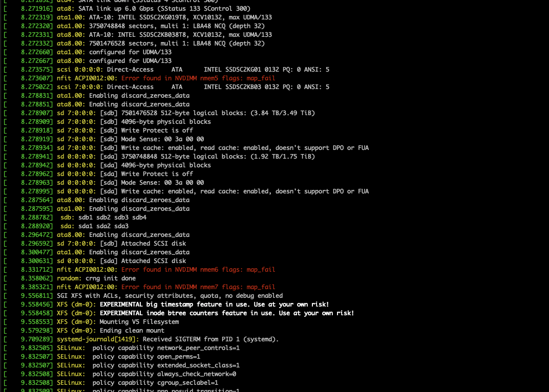 Created attachment 438 [details] dmesg报错 Description of problem: SPR机型上启动anolis23 5.10内核后,dmesg报错error found in NVDIMM nmem flags:map_fail Steps to Reproduce: 1.bmc上传iso镜像 2.reboot 3.系统启动查询dmesg Actual results: 有报错,见附件截图 Expected results: 无报错