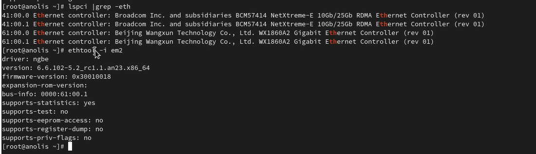Created attachment 1390 [details] ngbe驱动图 Description of problem: [Anolis23.4][RCx][x86_64][wangxun]NF5280A6安装完系统后网讯千兆网卡配置ip不通 Version-Release number of selected component (if applicable): [root@anolis ~]# uname -a Linux anolis 6.6.102-5.2_rc1.1.an23.x86_64 #1 SMP PREEMPT_DYNAMIC Wed Nov 19 14:58:10 CST 2025 x86_64 x86_64 x86_64 GNU/Linux [root@anolis ~]# cat /etc/os-release NAME="Anolis OS" VERSION="23.4" ID="anolis" VERSION_ID="23.4" PLATFORM_ID="platform:an23" PRETTY_NAME="Anolis OS 23.4" ANSI_COLOR="0;31" HOME_URL="https://openanolis.cn/" BUG_REPORT_URL="https://bugzilla.openanolis.cn/" 下载地址 https://gitee.com/link?target=https%3A%2F%2Fbuild.openanolis.cn%2Fkojifiles%2Frsync%2Fanolis%2F23.4%2Fisos%2FBETA%2Fx86_64%2F How reproducible: Steps to Reproduce: 1.NF5280A6安装系统 2.选择网讯千兆网卡配置ip Actual results: ip不通,驱动正常加载 Expected results: 配置ip正常可以ping通 Additional info: 网卡驱动ngbe正常加载卸载未出现报错