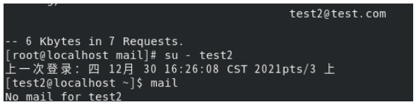 Created attachment 79 [details] 用例截图 环境 硬件:飞腾2500服务器创建arm虚拟机 软件: AnolisOS-7.9-RC1-aarc64-dvd.iso [前置条件] 1.dovecot服务已经启动 2.chmod 0600 /var/spool/mail/* [步骤] 1.查看无法发出的消息队列 [root@localhost ~]# postqueue -p 2.切换到test2账号,查看test2用户的收件箱,终端执行:mail [结果] 1.root@localhost ~]# postqueue -p 出信息中包含 85F68402EB6A的信件 2.查看没有收到信件 [期望] 1.出信息中不包含 85F68402EB6A的信件 2.查看到test1@test.com发送的邮件,输出信息如下所示: Heirloom Mail version 12.4 7/29/08. Type ? for help. "/var/spool/mail/test2": 1 message 1 unread >U 1 test1@test.com Wed Nov 28 17:45 16/489 "mail_1"