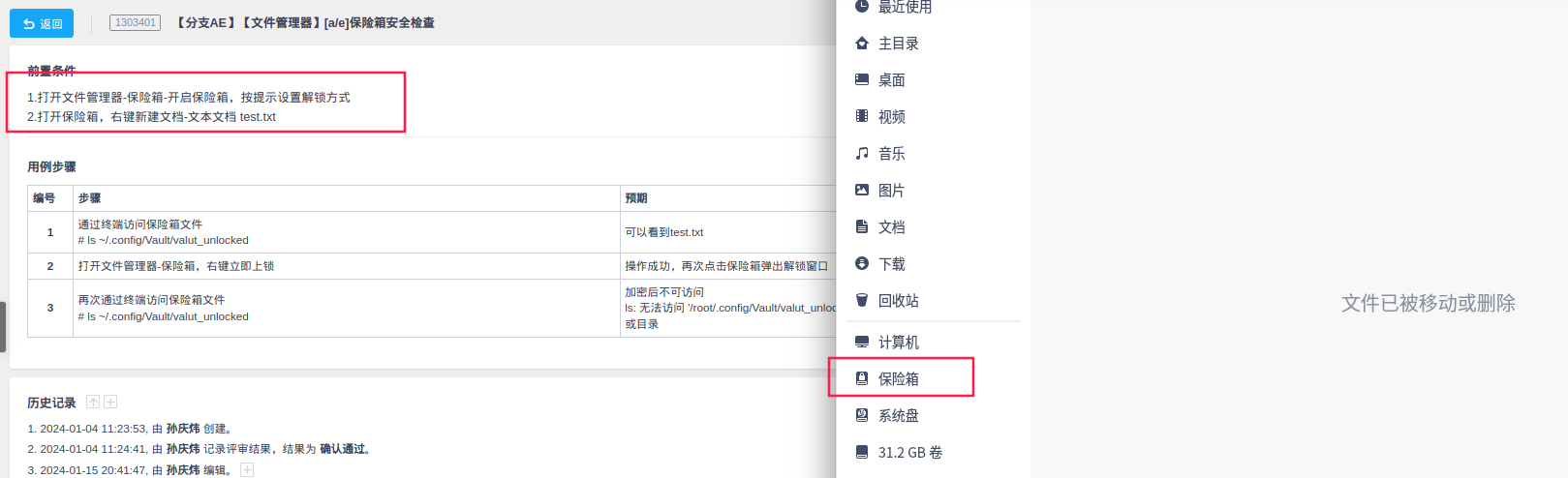 Created attachment 1444 [details] 打开保险箱-文件已被移动或删除 环境: 1. https://build.openanolis.cn/kojifiles/rsync/anolis/23.4/isos/BETA/ x86 ARM loongarch 步骤: 1、文件管理器打开保险箱 实际结果: 打开保险箱-失败,文件已被移动或删除 期望结果: 可以成功打开保险箱