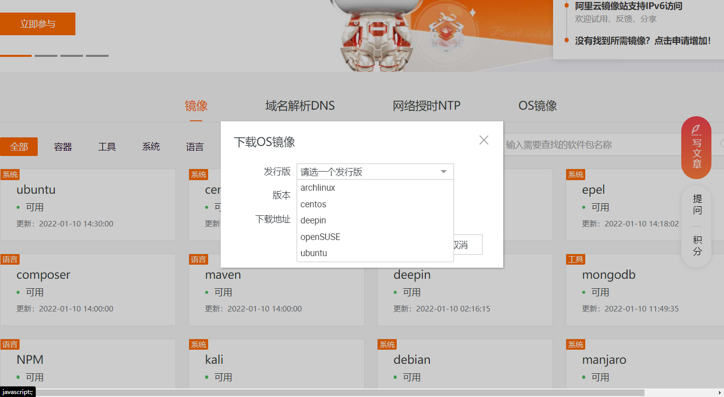 Created attachment 104 [details] https://developer.aliyun.com/mirror/ Description of problem: 建议阿里云的镜像站网站页面加一个anolis镜像 Version-Release number of selected component (if applicable): How reproducible: 打开 https://developer.aliyun.com/mirror/ 点击OS镜像,下拉框中无anolis镜像 Steps to Reproduce: 1. 2. 3. Actual results: 点击OS镜像,下拉框中无anolis镜像 Expected results: 阿里云的镜像站网站OS镜像页面加一个anolis镜像 Additional info: