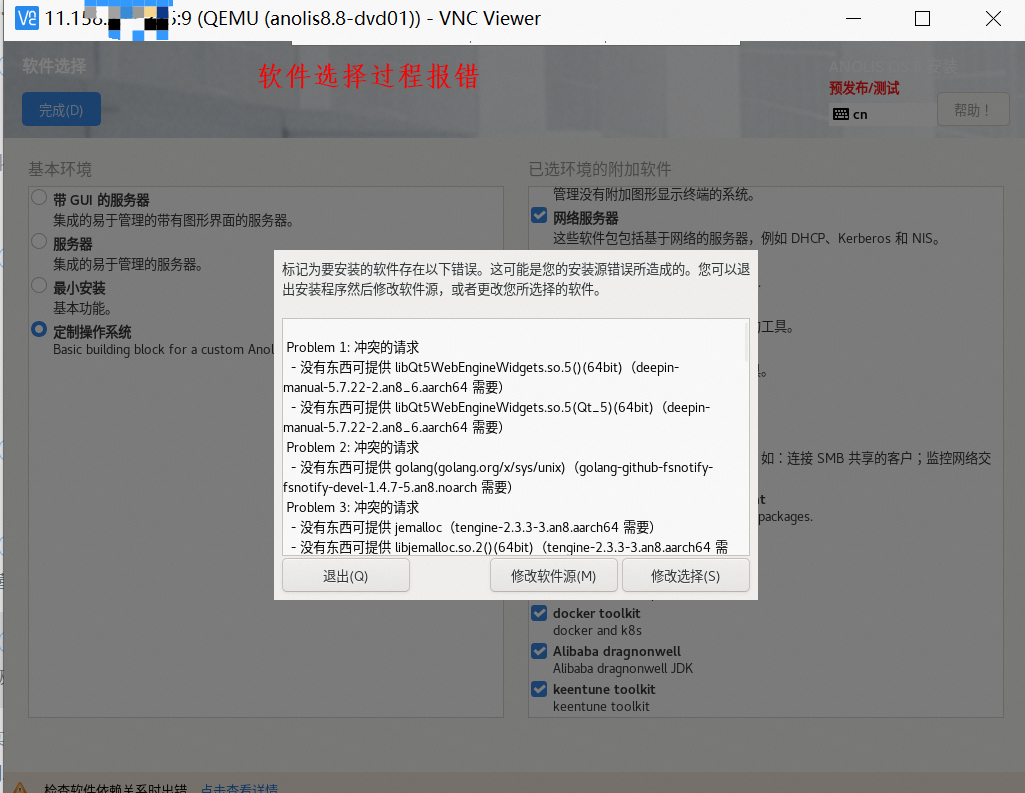 [问题描述] 在物理机上使用镜像anolis-8.8-aarch64-dvd.iso,通过kvm方式安装启动系统,安装过程软件选择:定制操作系统(右全勾) 提示有依赖问题 详细报错见附加截图