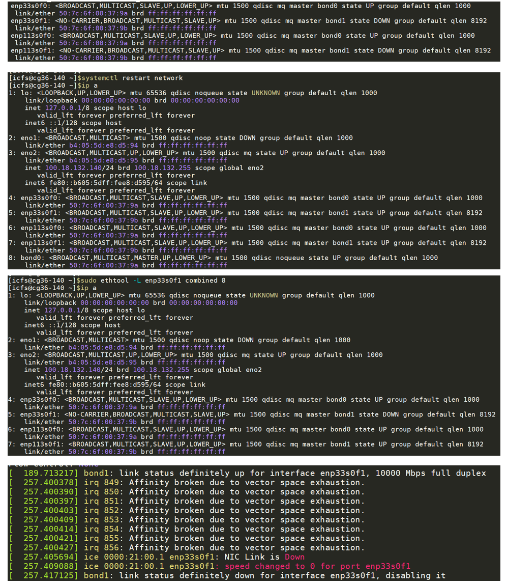 OS: Anolis 8.6 kernel: 4.19 网卡型号:Intel Corporation Ethernet Controller E810-XXV 复现步骤: 1、执行命令:ethtool -L enp33s0f0 combined 8 2、ip a查看网卡状态 发现enp33s0f0变为down状态 3、执行systemctl restart network 4、发现enp33s0f0变为up状态 以上步骤可以重复复现 5、执行rmmod ice & insmod ice 发现如上的问题不再复现。 dmesg日志如图
