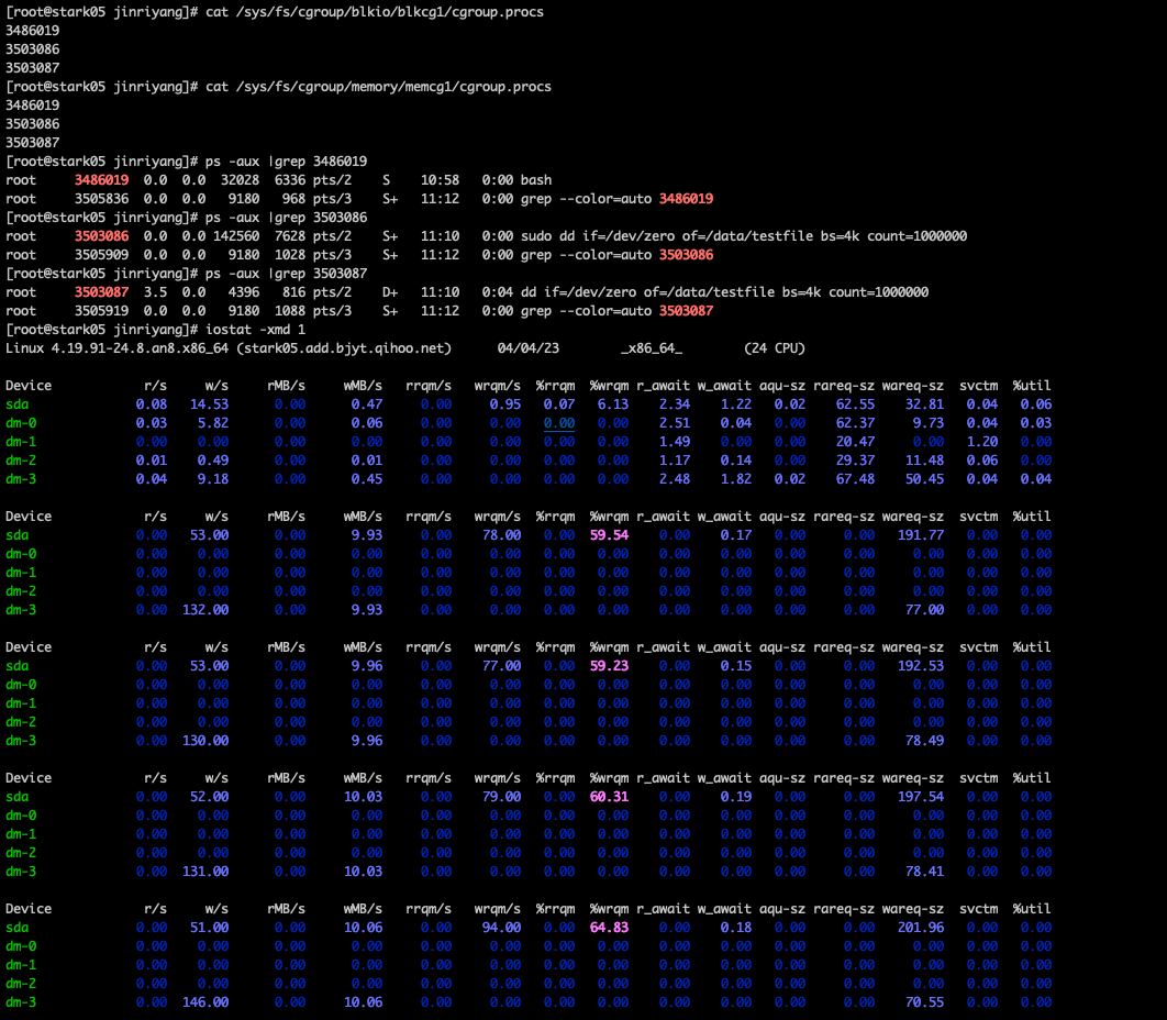 (In reply to jinriyang from comment #4) > 你可以看下我刚上传的复现步骤2的图片,打开两个终端,一个进行限速操作,当限速生效时,在第二个终端执行docker run 命令会直接卡住。 > 当限速生效时 查看写进程 其状态是D > root 3345447 9.4 0.0 4396 876 pts/0 D+ 09:15 0:03 dd > if=/dev/zero of=/data/testfile bs=4k count=1000000 贴下你具体的内核版本 uname -r 然后贴下你所要限制的 blkcg 的 cgroup.procs, 看里面有哪些进程, 注意需要将pid转为进程名,方便定位,该步骤是想排查是否有无关的 docker 服务进程被限速。 “docker run 命令会直接卡住”, 这个会卡住多久?你可以做个实验,将 dd if=/dev/zero of=/data/testfile bs=4k count=1000000 调整为 count=2560 再试下,看下 docker run 是否只卡住10s左右。