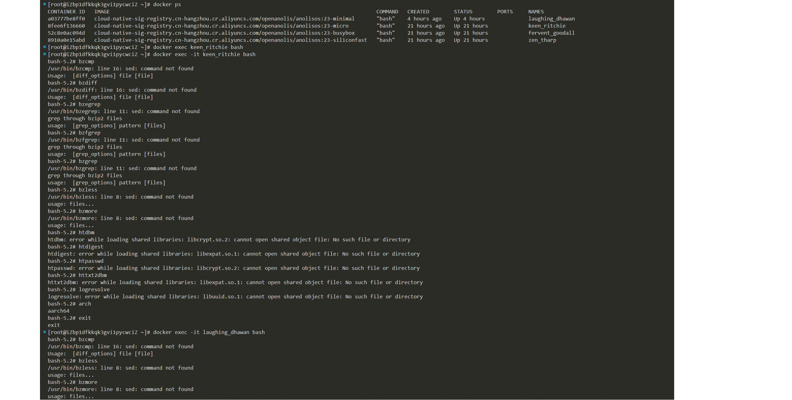 Created attachment 810 [details] 容器基础命令报错 Description of problem: anolisos:23-micro和anolisos:23-minimal容器镜像在使用的时候存在报错: bash-5.2# bzcmp /usr/bin/bzcmp: line 16: sed: command not found Usage: [diff_options] file [file] bash-5.2# bzdiff /usr/bin/bzdiff: line 16: sed: command not found Usage: [diff_options] file [file] bash-5.2# bzegrep /usr/bin/bzegrep: line 11: sed: command not found grep through bzip2 files usage: [grep_options] pattern [files] bash-5.2# bzfgrep /usr/bin/bzfgrep: line 11: sed: command not found grep through bzip2 files usage: [grep_options] pattern [files] bash-5.2# bzgrep /usr/bin/bzgrep: line 11: sed: command not found grep through bzip2 files usage: [grep_options] pattern [files] bash-5.2# bzless /usr/bin/bzless: line 8: sed: command not found usage: files... bash-5.2# bzmore /usr/bin/bzmore: line 8: sed: command not found usage: files... bash-5.2# htdbm htdbm: error while loading shared libraries: libcrypt.so.2: cannot open shared object file: No such file or directory bash-5.2# htdigest htdigest: error while loading shared libraries: libexpat.so.1: cannot open shared object file: No such file or directory bash-5.2# htpasswd htpasswd: error while loading shared libraries: libcrypt.so.2: cannot open shared object file: No such file or directory bash-5.2# httxt2dbm httxt2dbm: error while loading shared libraries: libexpat.so.1: cannot open shared object file: No such file or directory bash-5.2# logresolve logresolve: error while loading shared libraries: libuuid.so.1: cannot open shared object file: No such file or directory Steps to Reproduce: 1.docker pull cloud-native-sig-registry.cn-hangzhou.cr.aliyuncs.com/openanolis/anolisos:23-micro && docker pull cloud-native-sig-registry.cn-hangzhou.cr.aliyuncs.com/openanolis/anolisos:23-minimal 2.docker run -itd cloud-native-sig-registry.cn-hangzhou.cr.aliyuncs.com/openanolis/anolisos:23-micro bash && docker run -itd cloud-native-sig-registry.cn-hangzhou.cr.aliyuncs.com/openanolis/anolisos:23-minimal bash 3. docker exec -it NAMES bash Actual results: 执行基础命令存在command not fonud或error报错 Expected results: 执行基础命令没有报错 Additional info: