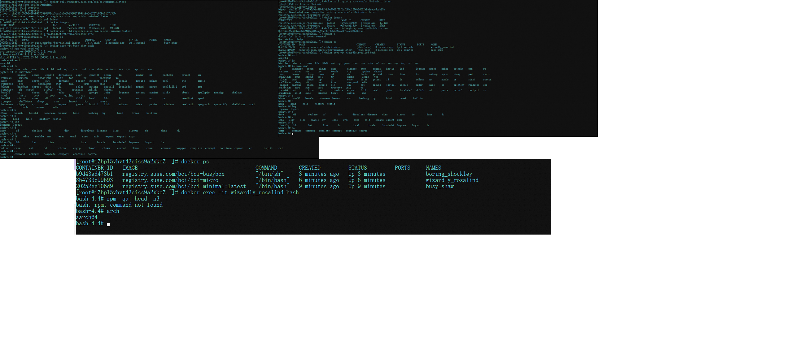 使用suse的容器镜像registry.suse.com/bci/bci-minimal:latest,registry.suse.com/bci/bci-micro:latest,registry.suse.com/bci/bci-busybox:latest suse的mini,micro精简镜像里没有bz*和ht*以及logresolve相关的命令 suse的busybox精简镜像里没有dumpleases,conspy,eject命令,在suse的busybox里直接执行last和在anolis23的busybox里直接执行last结果情况相同,详情见附件