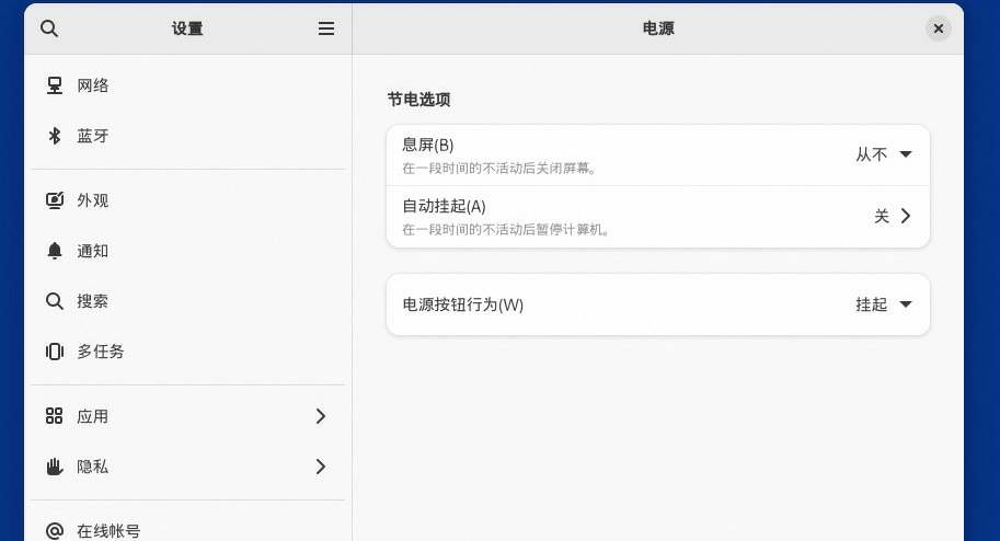 Created attachment 818 [details] 电源配置 Description of problem: 物理机pxe安装iso镜像,安装GUI,设置电源不挂起,一段时间后依旧挂起 Steps to Reproduce: 1.U盘刻盘或者pxe安装iso 2.安装选项选择GUI 3.进入系统后,设置电源不挂起 Actual results: 一段时间后挂起 Expected results: 不挂起 Additional info: 原先遇到过该问题,通过sleep.conf中配置allowsuspend=no规避