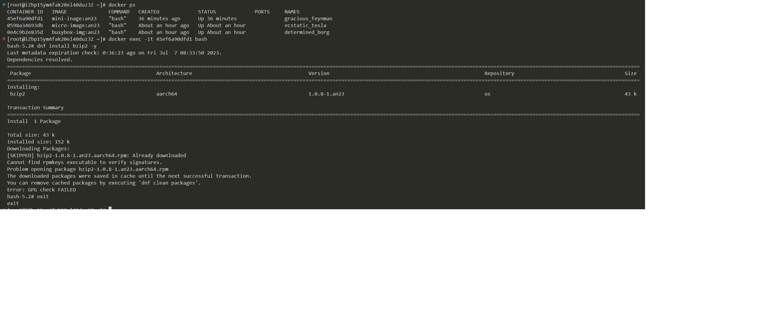 Created attachment 832 [details] 精简容器执行dnf install命令失败 Description of problem: 使用精简镜像minimal-arm-initrd.cpio.gz解压并构建完成后运行docker,执行dnf install bzip2 -y报错: Cannot find rpmkeys executable to verify signatures. Problem opening package bzip2-1.0.8-1.an23.aarch64.rpm The downloaded packages were saved in cache until the next successful transaction. You can remove cached packages by executing 'dnf clean packages'. Error: GPG check FAILED Steps to Reproduce: 1.下载minimal-arm-initrd.cpio.gz并解压 2.创建dockerfile 3.构建docker docker build -t mini-image:an23 . 4.运行docker docker run -it --rm mini-image:an23 5. 执行命令 dnf install bzip2 -y Actual results: dnf安装bzip2失败 Expected results: 正常安装bzip2 Additional info: cat dockerfile FROM scratch COPY test / CMD ["bash"]