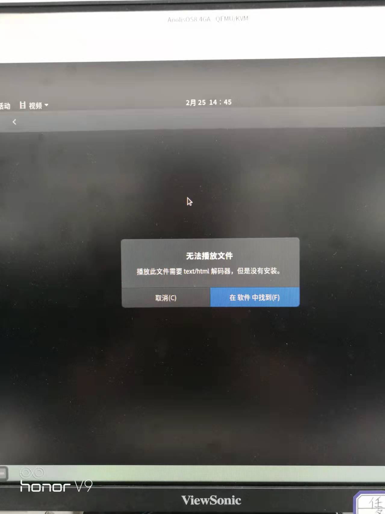 Created attachment 163 [details] 缺少解码器提示信息 [环境] 硬件:Loongarch64架构的龙芯3A5000台式机 cpu: loongson-3A5000LL 内存:16G 硬盘:256G 软件:AnolisOS8.4_GA_loongarch64系统 前提条件:iso集成视频播放器(Totem) 步骤: 1. 活动——显示应用——视频。 2. 添加网络视频,添加网络视频地址,点击播放视频。 [实际结果] 提示播放此文件需要text/html解码器。 [期望结果] 可以正常播放网络视频。 详情见附件截图。