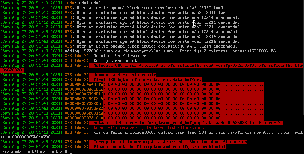Created attachment 874 [details] the dmesg kernel log Description of problem: install A guest os (xfs) will be failed when the disk file is in a ocfs2(cluster size 1M ) of a host (the host os pagesize 64K ) Version-Release number of selected component (if applicable): How reproducible: Steps to Reproduce: 1: hostos aarch64 environment, pagesize 64K 2: mkfs.ocfs2 -b 4k -C 1M -L V1637060513 -N 32 -F -x /dev/sdi4 this issue just happen when clustersize is not 4k(default) 3: mount /dev/sdi4 /mnt/ 4: qemu-img create -f qcow2 /mnt/ocfs2issue 20G 5: use the /mnt/ocfs2issue file as a disk image to install a OS. 6: when the default filesystem is xfs, and format the disk, it will report some error Actual results: the install failed Expected results: the install successed Additional info: