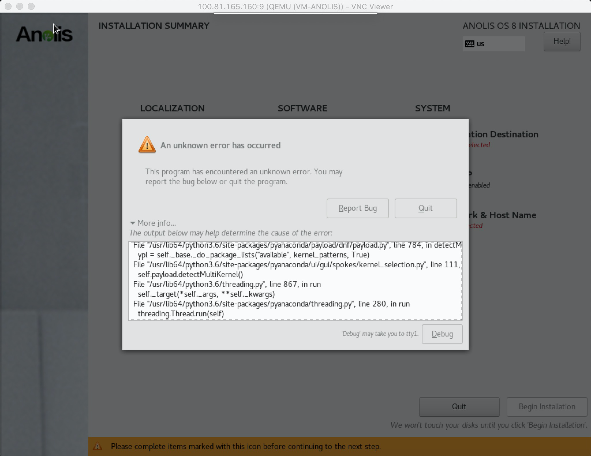 Created attachment 170 [details] 截图 Description of problem: 这个错误普遍存在与Anolis 8的boot镜像中,boot iso无法完成系统安装。 How reproducible: Steps to Reproduce: 1. clone https://gitee.com/anolis/rel-eng/tree/a8/distro/pungi 参考readme里的第三行命令 生成Anolis ISO镜像,compose目录下的BaseOS/<arch>/iso/里会有生成的boot iso镜像 2. 下载boot iso镜像并用虚拟机启动图形安装 3. 选择语言后点击下一步 Actual results: 安装失败 Expected results: 界面组件可以点击并配置安装信息 Additional info: