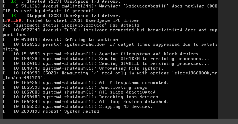 Created attachment 899 [details] 所使用的Kickstart文件 Description of problem:Failed to start iSCSI UserSpace I/0 driver Version-Release number of selected component (if applicable): How reproducible: Steps to Reproduce: 1.使用cobbler安装AnolisOS-8.6-x86_64-dvd.iso 2.随后报错提示Failed to start iSCSI UserSpace I/0 driver...reboot:System halted 3.就一直卡住了,尝试更换版本,8.8或者8.8mini镜像均同样的报错。手动使用光盘加载的方式安装就没问题,是否pxe安装触发了什么bug Actual results: Expected results: Additional info: