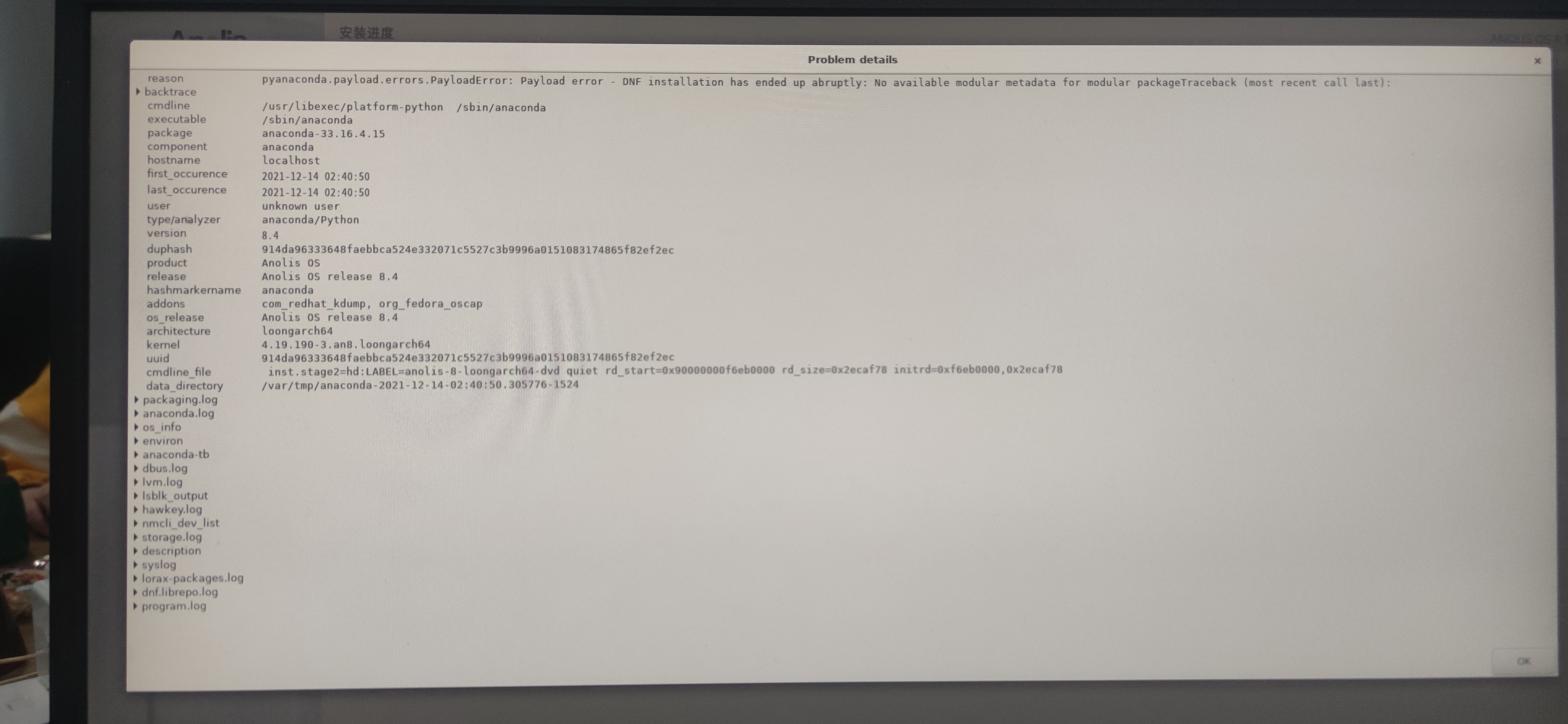 镜像安装,软件选择--> GUI服务器 --> (额外添加)开发工具 ,就会安装报错,失败 尝试了scp上传log,失败,所以就截图放到这里吧。 截图见附件 系统镜像: http://8.131.87.1/kojifiles/output/an-8-loongarch64-RC1/compose/BaseOS/loongarch64/iso/