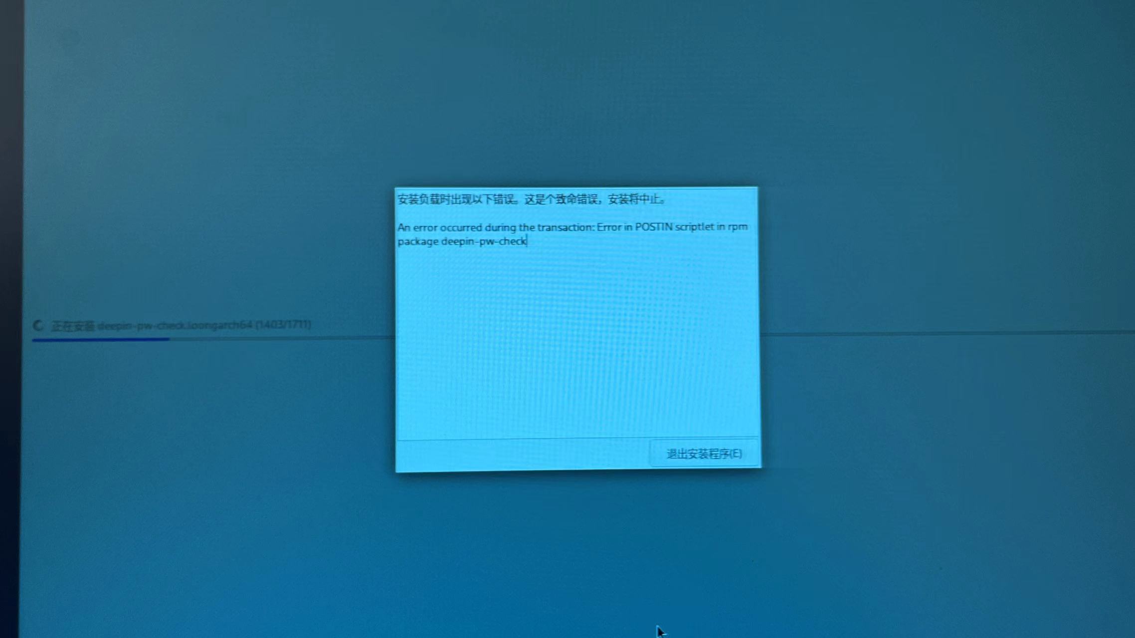 Created attachment 988 [details] dde桌面安装失败 Description of problem: RC2.iso安装启动失败 iso下载: https://build.openanolis.cn/kojifiles/output/anolis-23-20240124.11/compose/os/loongarch64/iso/anolis-23-loongarch64-dvd1-20240124.11.iso Steps to Reproduce: 1.dd 刻录U盘启动盘,在机器上安装启动 2.在软件选择中选择“带GUI的” Actual results: 安装时界面报错,界面提示“An error occurred during the transaction:Error in POSTIN scriptlet in rpm package deepin-pw-check ” Expected results: dde桌面可正常安装 Additional info: