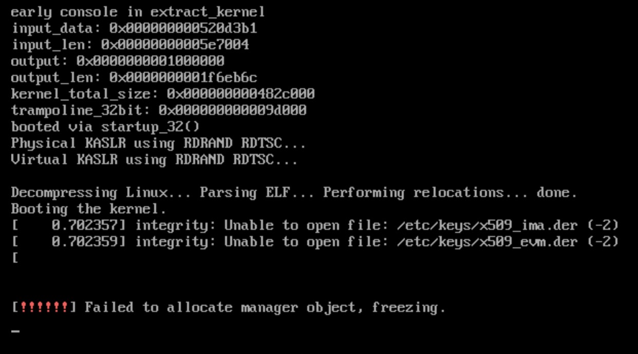 从报错的 log 看是分配置什么系统资源失败了, 启动停止. 可能是 console log 级别的问题, 没有更多的 log 显示究竟是分配什么资源, 因为什么分配失败. @ylsong 帮忙调整一下系统 consolelog 看看能否打出更多的信息: grubby --args="console=hvc0 loglevel=7" --update-kernel=AlL 试试能否打出更多的内核信息.
