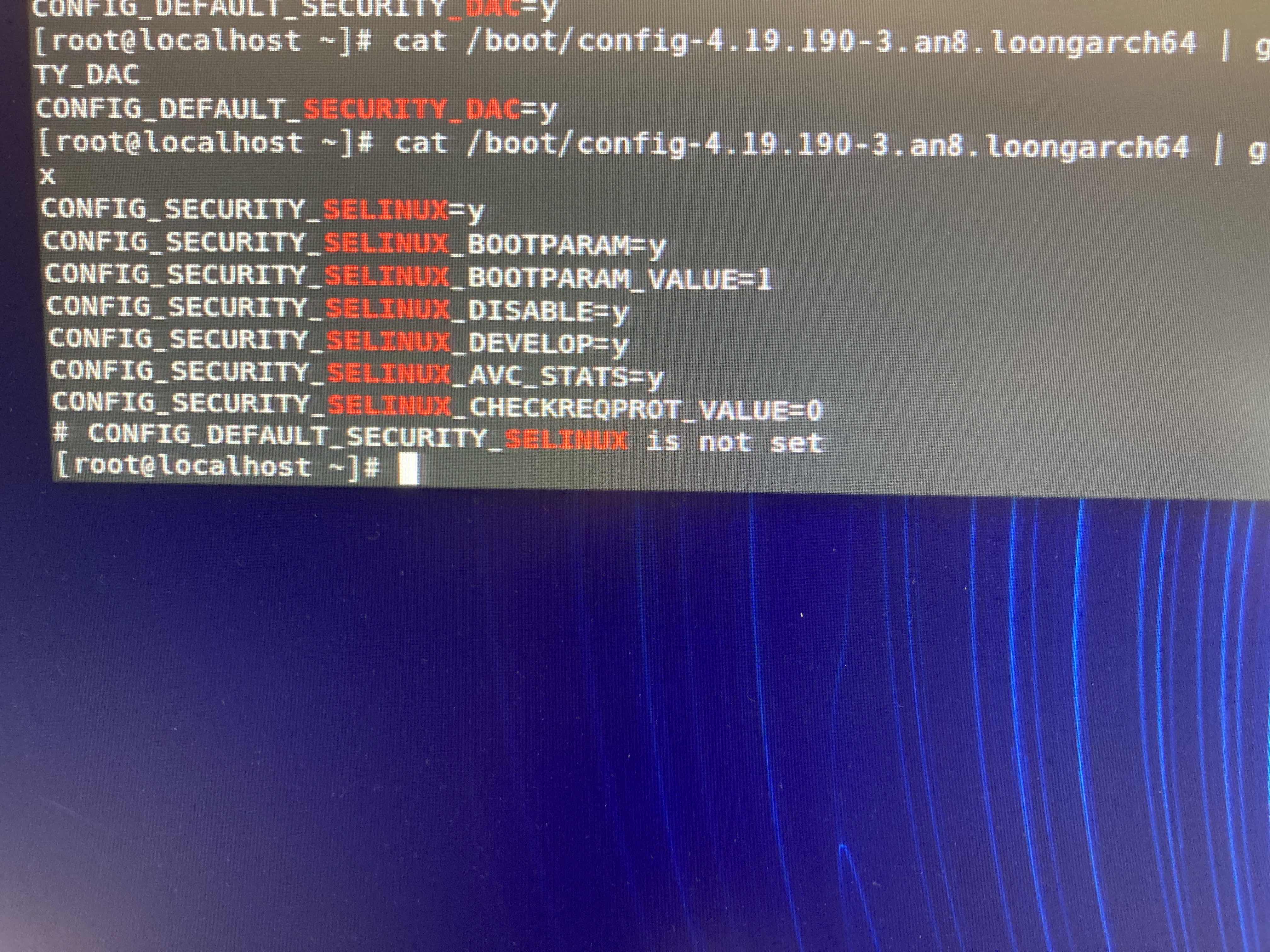 目前状态: 龙芯上配置SELINUX=enforcing之后,重启之后发现selinux并没有enable,目前已经通过修改cmdline(security=selinux)的方法fix了。 但是,在ECS上,配置SELINUX=enforcing之后,机器无法正常启动。目前怀疑是内核配置CONFIG_DEFAULT_SECURITY_DAC的问题,需要继续跟进。