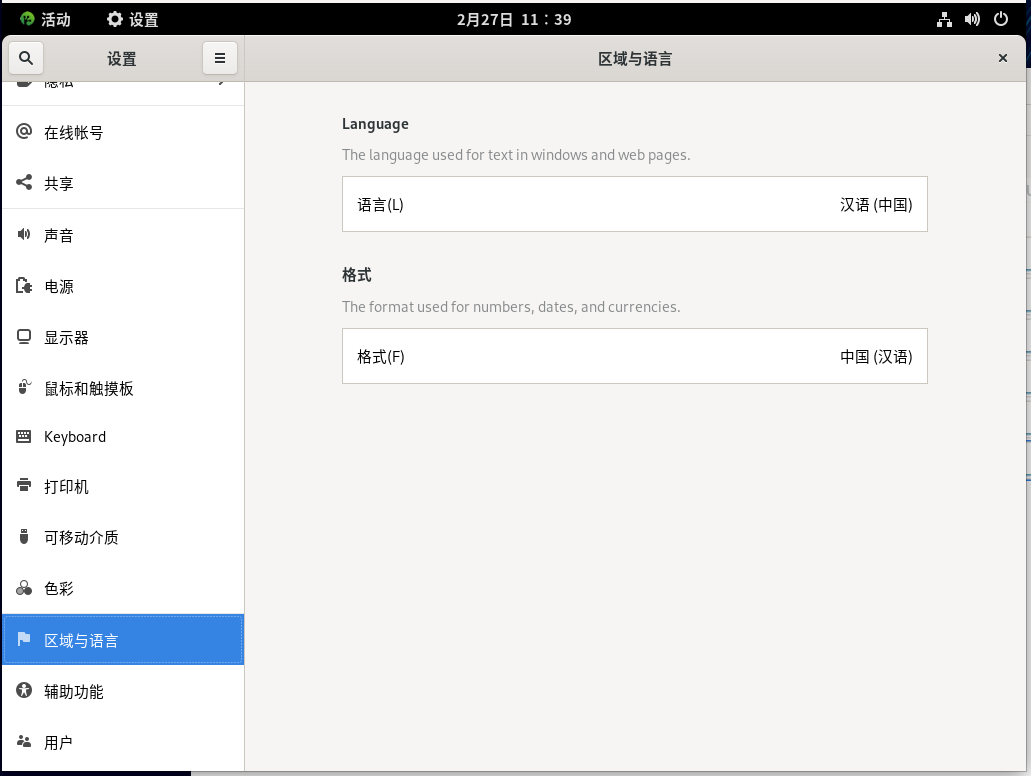Created attachment 1028 [details] 电源部分未完全汉化 Description of problem: Gnome桌面设置部分未完全汉化 Version-Release number of selected component (if applicable): 软件版本: #内核版本 4.19.190-7.7.an8.loongarch64 #系统版本 NAME="Anolis OS" VERSION="8.9" ID="anolis" ID_LIKE="rhel fedora centos" VERSION_ID="8.9" PLATFORM_ID="platform:an8" PRETTY_NAME="Anolis OS 8.9" ANSI_COLOR="0;31" HOME_URL="https://openanolis.cn/" Steps to Reproduce: 1.在系统安装界面软件选择部分,选取“带GUI的服务器”,默认安装的是Gnome桌面 2.打开应用程序的设置部分 Actual results: 电源、键盘、语言三个部分界面未完全汉化 Expected results: 电源、键盘、语言三个部分界面完全汉化 Additional info: