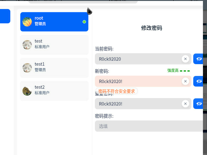 Created attachment 1039 [details] 密码 使用镜像: https://build.openanolis.cn/kojifiles/output/anolis-8-20240202.0/compose/BaseOS/x86_64/iso/anolis-8-x86_64-dvd1-20240202.0.iso https://build.openanolis.cn/kojifiles/output/anolis-8-20240202.0/compose/BaseOS/aarch64/iso/anolis-8-aarch64-dvd1-20240202.0.iso https://build.openanolis.cn/kojifiles/output/anolis-8-20240202.0/compose/BaseOS/loongarch64/iso/anolis-8-loongarch64-dvd1-20240202.0.iso 测试方法: 1、安装时勾选DDE组件,安装成功后使用root账户进入系统 2、点击控制中心-账户 3、修改密码 实际结果: 1、提升不符合安全要求 预期结果: 1、如不符合安全要求提示相关要求,并可正常修改符合要求的密码