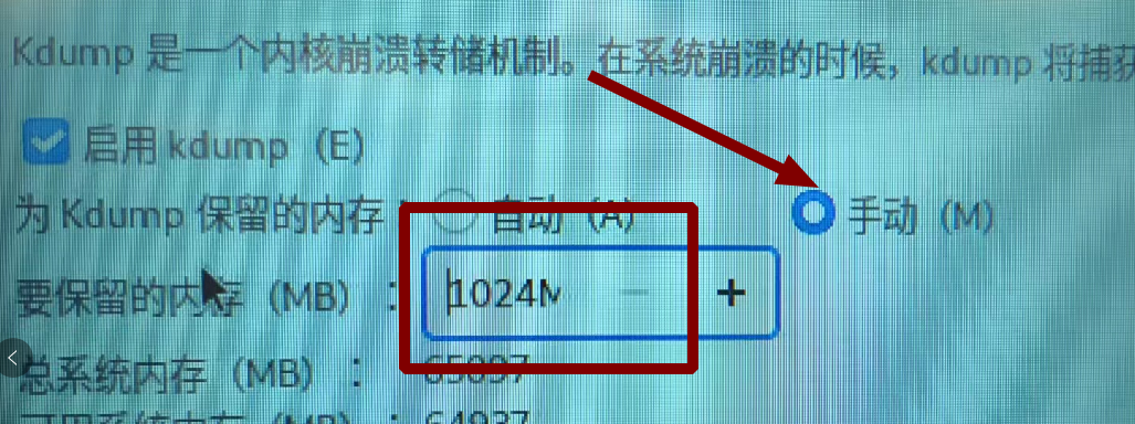 这个问题触发kdump失败的原因是: 龙蜥默认ISO安装界面启用kdump后如果使用自动配置生成的crashkernel存在问题【见附件:龙蜥默认kdump设置选项】。导致kdump触发失败。 在大内存服务器机器推荐手动配置crashkernel=1024M。目前发现512M有些保守,偶尔在kdump过程中出现oom(内存不足的情况),详细配置方法【见附件:推荐kdump配置】。 结论: 非内核或kdump工具bug。属于参数配置问题。建议使用手动配置crashkernel参数。