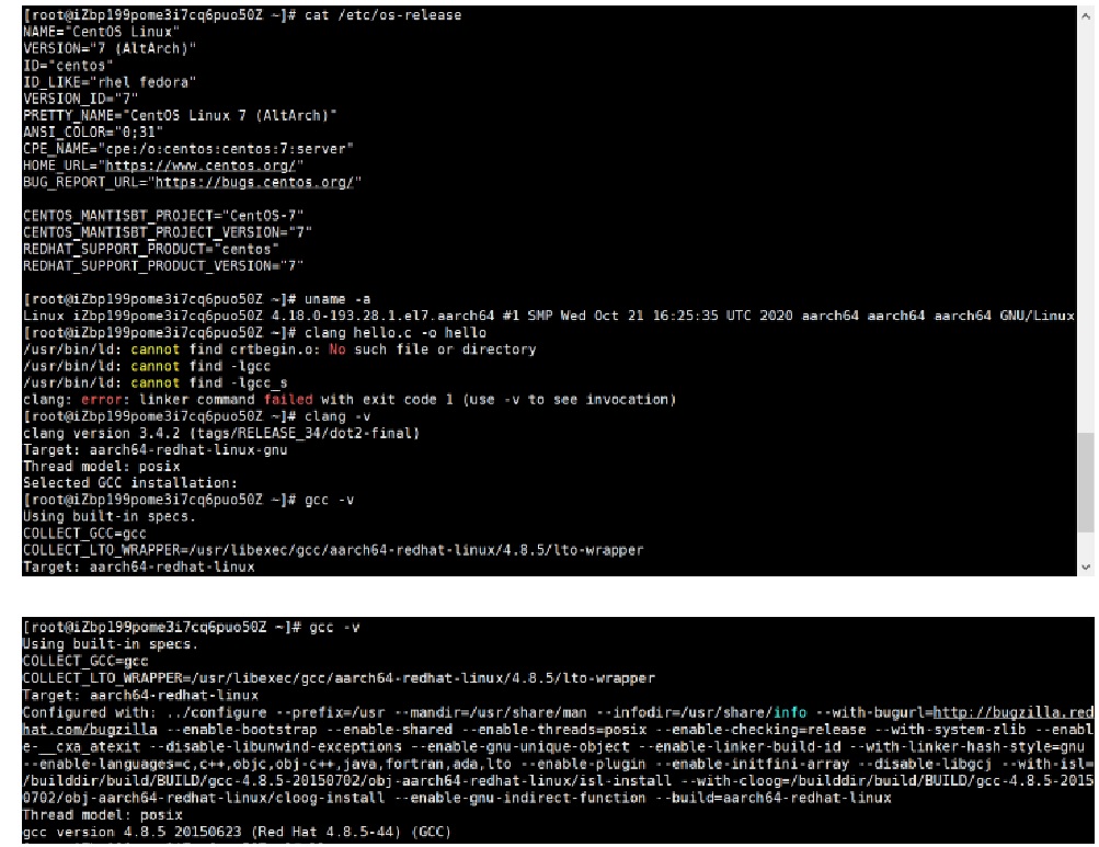Description of problem: 加载Anolis7.9 ARM64镜像后,使用clang编译.c文件时,出现错误 # clang hello.c -o hello2 /usr/bin/ld: 找不到 crtbegin.o: 没有那个文件或目录 /usr/bin/ld: 找不到 -lgcc /usr/bin/ld: 找不到 -lgcc_s clang: error: linker command failed with exit code 1 (use -v to see invocation) Version-Release number of selected component (if applicable): # cat /etc/image-id image_name="Anolis OS 7.9 RHCK 64 bit ARM Edition" image_id="anolisos_7_9_arm64_20G_rhck_alibase_20220413.vhd" release_date="20220413173429" # clang -v clang version 3.4.2 (tags/RELEASE_34/dot2-final) Target: aarch64-redhat-linux-gnu Thread model: posix Selected GCC installation: gcc -v 使用内建 specs。 COLLECT_GCC=gcc COLLECT_LTO_WRAPPER=/usr/libexec/gcc/aarch64-redhat-linux/4.8.5/lto-wrapper 目标:aarch64-redhat-linux 配置为:../configure --prefix=/usr --mandir=/usr/share/man --infodir=/usr/share/info --with-bugurl=https://bugs.openanolis.cn --enable-bootstrap --enable-shared --enable-threads=posix --enable-checking=release --with-system-zlib --enable-__cxa_atexit --disable-libunwind-exceptions --enable-gnu-unique-object --enable-linker-build-id --with-linker-hash-style=gnu --enable-languages=c,c++,objc,obj-c++,java,fortran,ada,lto --enable-plugin --enable-initfini-array --disable-libgcj --with-isl=/builddir/build/BUILD/gcc-4.8.5-20150702/obj-aarch64-redhat-linux/isl-install --with-cloog=/builddir/build/BUILD/gcc-4.8.5-20150702/obj-aarch64-redhat-linux/cloog-install --enable-gnu-indirect-function --build=aarch64-redhat-linux 线程模型:posix gcc 版本 4.8.5 20150623 (Anolis 4.8.5-44.0.1) (GCC) How reproducible: 必现 Steps to Reproduce: 1.部署anolisos_7_9_arm64_20G_rhck_alibase_20220413.vhd镜像 2.安装clang yum install clang -y 3.编写简单的.c文件,如: #include<stdio.h> int main() { printf("Hello World!\n"); return 0; } 4、使用clang编译: clang hello.c -o hello Actual results: 编译出错,未生成对应可执行文件 Expected results: 编译成功,生成可执行文件且可正常运行 Additional info: