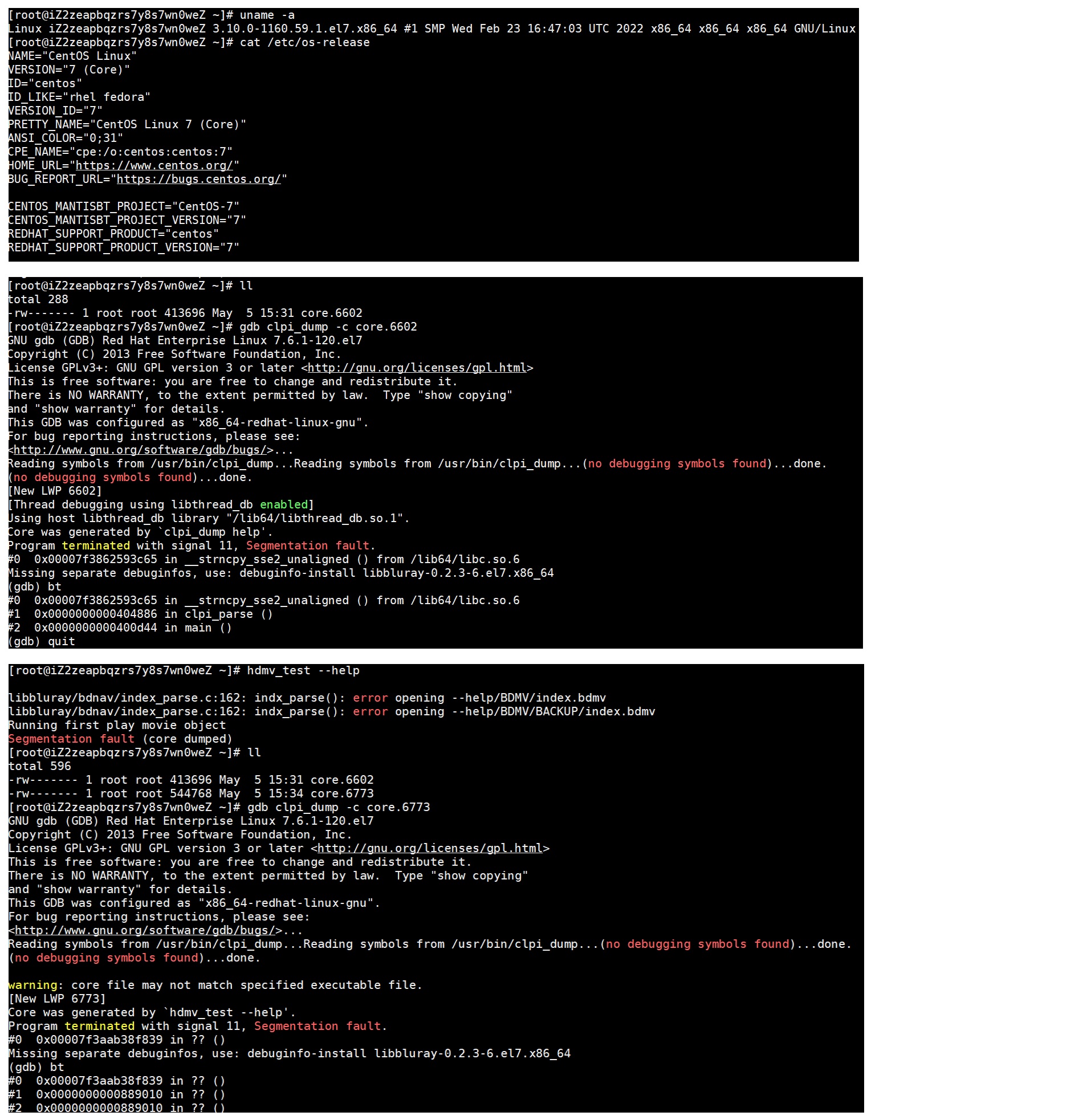 Description of problem: 执行clpi_dump help和hdmv_test --help命令会产生coredump Version-Release number of selected component (if applicable): uname -r 4.18.0-193.28.1.an7.aarch64 cat /etc/anolis-release Anolis OS release 7.9 cat /etc/os-release NAME="Anolis OS" VERSION="7.9" ID="anolis" ID_LIKE="rhel fedora centos" VERSION_ID="7.9" PRETTY_NAME="Anolis OS 7.9" ANSI_COLOR="0;31" HOME_URL="https://openanolis.cn/" BUG_REPORT_URL="https://bugs.openanolis.cn/" CENTOS_MANTISBT_PROJECT="CentOS-7" CENTOS_MANTISBT_PROJECT_VERSION="7" REDHAT_SUPPORT_PRODUCT="centos" REDHAT_SUPPORT_PRODUCT_VERSION="7" How reproducible: 1、 安装libbluray 软件包 2、 执行clpi_dump help\hdmv_test --help 命令 Steps to Reproduce: # clpi_dump help Failed to open help 段错误(吐核) # # ll 总用量 1220 -rw------- 1 root root 1376256 4月 22 17:07 core-clpi_dump-26676 # # gdb clpi_dump -c core-clpi_dump-26676 GNU gdb (GDB) Red Hat Enterprise Linux 7.6.1-120.an7 Copyright (C) 2013 Free Software Foundation, Inc. License GPLv3+: GNU GPL version 3 or later <http://gnu.org/licenses/gpl.html> This is free software: you are free to change and redistribute it. There is NO WARRANTY, to the extent permitted by law. Type "show copying" and "show warranty" for details. This GDB was configured as "aarch64-redhat-linux-gnu". For bug reporting instructions, please see: <http://www.gnu.org/software/gdb/bugs/>... Reading symbols from /usr/bin/clpi_dump...Reading symbols from /usr/bin/clpi_dump...(no debugging symbols found)...done. (no debugging symbols found)...done. [New LWP 26676] [Thread debugging using libthread_db enabled] Using host libthread_db library "/lib64/libthread_db.so.1". Core was generated by `clpi_dump help'. Program terminated with signal 11, Segmentation fault. #0 0x0000ffff9e696bc4 in strncpy () from /lib64/libc.so.6 Missing separate debuginfos, use: debuginfo-install libbluray-0.2.3-6.an7.aarch64 (gdb) bt #0 0x0000ffff9e696bc4 in strncpy () from /lib64/libc.so.6 #1 0x0000000000404884 in clpi_parse () #2 0x0000000000400f80 in main () (gdb) quit # hdmv_test --help libbluray/bdnav/index_parse.c:162: indx_parse(): error opening --help/BDMV/index.bdmv libbluray/bdnav/index_parse.c:162: indx_parse(): error opening --help/BDMV/BACKUP/index.bdmv Running first play movie object 段错误(吐核) # gdb hdmv_test -c core-hdmv_test-26760 GNU gdb (GDB) Red Hat Enterprise Linux 7.6.1-120.an7 Copyright (C) 2013 Free Software Foundation, Inc. License GPLv3+: GNU GPL version 3 or later <http://gnu.org/licenses/gpl.html> This is free software: you are free to change and redistribute it. There is NO WARRANTY, to the extent permitted by law. Type "show copying" and "show warranty" for details. This GDB was configured as "aarch64-redhat-linux-gnu". For bug reporting instructions, please see: <http://www.gnu.org/software/gdb/bugs/>... Reading symbols from /usr/bin/hdmv_test...Reading symbols from /usr/bin/hdmv_test...(no debugging symbols found)...done. (no debugging symbols found)...done. [New LWP 26760] [Thread debugging using libthread_db enabled] Using host libthread_db library "/lib64/libthread_db.so.1". Core was generated by `hdmv_test --help'. Program terminated with signal 11, Segmentation fault. #0 0x0000ffff916639d8 in _play_title () from /usr/lib64/libbluray.so.1 Missing separate debuginfos, use: debuginfo-install libbluray-0.2.3-6.an7.aarch64 (gdb) bt #0 0x0000ffff916639d8 in _play_title () from /usr/lib64/libbluray.so.1 #1 0x0000000000400da8 in main () (gdb) Actual results: 产生coredump Expected results: 不应该coredmp Additional info: 软件包信息: # yum info libbluray 已加载插件:fastestmirror, langpacks, product-id, search-disabled-repos, subscription-manager This system is not registered with an entitlement server. You can use subscription-manager to register. Loading mirror speeds from cached hostfile 已安装的软件包 名称 :libbluray 架构 :aarch64 版本 :0.2.3 发布 :6.an7 大小 :946 k 源 :installed 来自源:os 简介 : Library to access Blu-Ray disks for video playback 网址 :http://www.videolan.org/developers/libbluray.html 协议 : LGPLv2+ 描述 : This package is aiming to provide a full portable free open source bluray : library, which can be plugged into popular media players to allow full bluray : navigation and playback on Linux. It will eventually be compatible with all : current titles, and will be easily portable and embeddable in standard players : such as mplayer and vlc. x86有同样的问题