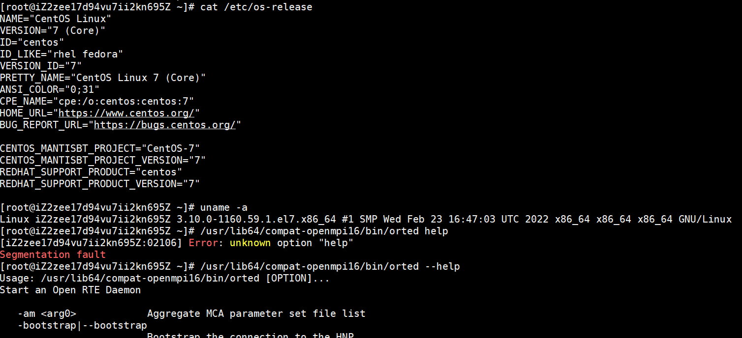 Created attachment 198 [details] centos7.9 test pic 验证该命令没有问题,请将/usr/lib64/compat-openmpi16/bin/orted help替换为/usr/lib64/compat-openmpi16/bin/orted --help命令