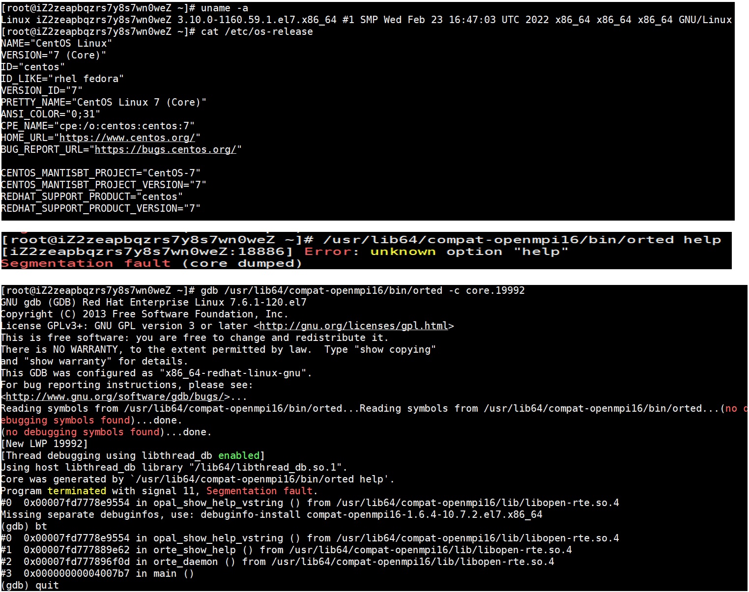 Description of problem: 执行/usr/lib64/compat-openmpi16/bin/orted help命令会产生coredump Version-Release number of selected component (if applicable): uname -r 4.18.0-193.28.1.an7.aarch64 cat /etc/anolis-release Anolis OS release 7.9 cat /etc/os-release NAME="Anolis OS" VERSION="7.9" ID="anolis" ID_LIKE="rhel fedora centos" VERSION_ID="7.9" PRETTY_NAME="Anolis OS 7.9" ANSI_COLOR="0;31" HOME_URL="https://openanolis.cn/" BUG_REPORT_URL="https://bugs.openanolis.cn/" CENTOS_MANTISBT_PROJECT="CentOS-7" CENTOS_MANTISBT_PROJECT_VERSION="7" REDHAT_SUPPORT_PRODUCT="centos" REDHAT_SUPPORT_PRODUCT_VERSION="7" 问题发生概率:必现 How reproducible: 1、安装compat-openmpi16软件包 2、执行/usr/lib64/compat-openmpi16/bin/orted help命令 Steps to Reproduce: # /usr/lib64/compat-openmpi16/bin/orted help [iZbp15h429qqsd6tfe3wpqZ:23511] Error: unknown option "help" 段错误(吐核) # gdb /usr/lib64/compat-openmpi16/bin/orted -c core-orted-23511 GNU gdb (GDB) Red Hat Enterprise Linux 7.6.1-120.an7 Copyright (C) 2013 Free Software Foundation, Inc. License GPLv3+: GNU GPL version 3 or later <http://gnu.org/licenses/gpl.html> This is free software: you are free to change and redistribute it. There is NO WARRANTY, to the extent permitted by law. Type "show copying" and "show warranty" for details. This GDB was configured as "aarch64-redhat-linux-gnu". For bug reporting instructions, please see: <http://www.gnu.org/software/gdb/bugs/>... Reading symbols from /usr/lib64/compat-openmpi16/bin/orted...Reading symbols from /usr/lib64/compat-openmpi16/bin/orted...(no debugging symbols found)...done. (no debugging symbols found)...done. [New LWP 23511] [Thread debugging using libthread_db enabled] Using host libthread_db library "/lib64/libthread_db.so.1". Core was generated by `/usr/lib64/compat-openmpi16/bin/orted help'. Program terminated with signal 11, Segmentation fault. #0 0x0000ffffb51316b8 in opal_show_help_vstring () from /usr/lib64/compat-openmpi16/lib/libopen-rte.so.4 Missing separate debuginfos, use: debuginfo-install compat-openmpi16-1.6.4-10.7.2.an7.aarch64 (gdb) bt #0 0x0000ffffb51316b8 in opal_show_help_vstring () from /usr/lib64/compat-openmpi16/lib/libopen-rte.so.4 #1 0x0000ffffb50d52e0 in orte_show_help () from /usr/lib64/compat-openmpi16/lib/libopen-rte.so.4 #2 0x0000ffffb50e1770 in orte_daemon () from /usr/lib64/compat-openmpi16/lib/libopen-rte.so.4 #3 0x0000000000400a00 in main () (gdb) quit Actual results: 产生coredump Expected results: 不应该coredmp Additional info: 软件包信息: # yum info compat-openmpi16 已加载插件:fastestmirror, langpacks, product-id, search-disabled-repos, subscription-manager This system is not registered with an entitlement server. You can use subscription-manager to register. Loading mirror speeds from cached hostfile 已安装的软件包 名称 :compat-openmpi16 架构 :aarch64 版本 :1.6.4 发布 :10.7.2.an7 大小 :15 M 源 :installed 来自源:os 简介 : Open MPI 1.6 compat library 网址 :http://www.open-mpi.org/ 协议 : BSD and MIT and Romio 描述 : Open MPI is an open source, freely available implementation of both the : MPI-1 and MPI-2 standards, combining technologies and resources from : several other projects (FT-MPI, LA-MPI, LAM/MPI, and PACX-MPI) in : order to build the best MPI library available. A completely new MPI-2 : compliant implementation, Open MPI offers advantages for system and : software vendors, application developers, and computer science : researchers. For more information, see http://www.open-mpi.org/ . : : This package provides compatibility for applications compiled with Open MPI : version 1.6. x86有同样的问题