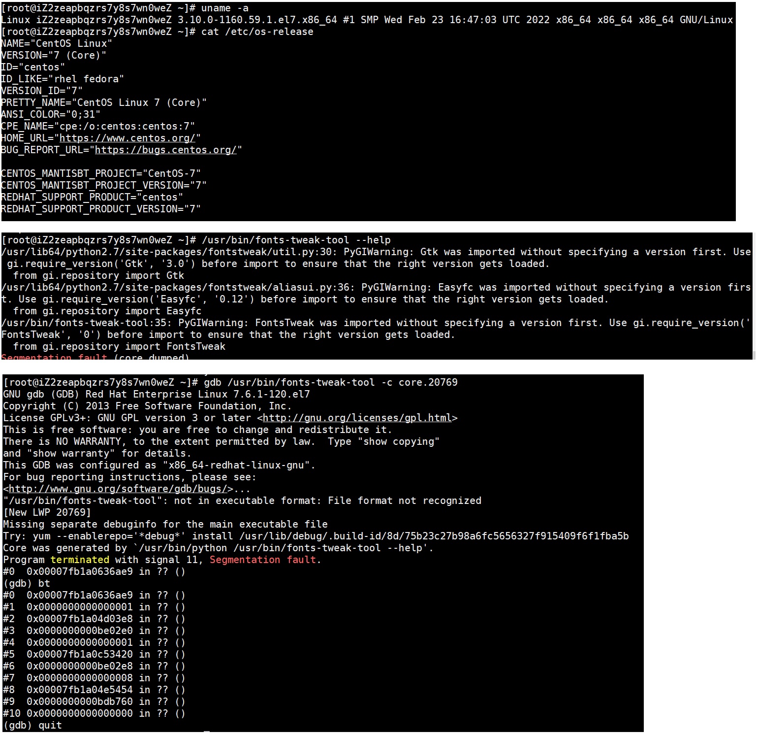Description of problem: 执行/usr/bin/fonts-tweak-tool --help命令会产生coredump Version-Release number of selected component (if applicable): uname -r 4.18.0-193.28.1.an7.aarch64 cat /etc/anolis-release Anolis OS release 7.9 cat /etc/os-release NAME="Anolis OS" VERSION="7.9" ID="anolis" ID_LIKE="rhel fedora centos" VERSION_ID="7.9" PRETTY_NAME="Anolis OS 7.9" ANSI_COLOR="0;31" HOME_URL="https://openanolis.cn/" BUG_REPORT_URL="https://bugs.openanolis.cn/" CENTOS_MANTISBT_PROJECT="CentOS-7" CENTOS_MANTISBT_PROJECT_VERSION="7" REDHAT_SUPPORT_PRODUCT="centos" REDHAT_SUPPORT_PRODUCT_VERSION="7" 问题发生概率:必现 How reproducible: 1、安装fonts-tweak-tool软件包 2、执行/usr/bin/fonts-tweak-tool --help命令 Steps to Reproduce: # /usr/bin/fonts-tweak-tool --help /usr/lib64/python2.7/site-packages/fontstweak/util.py:30: PyGIWarning: Gtk was imported without specifying a version first. Use gi.require_version('Gtk', '3.0') before import to ensure that the right version gets loaded. from gi.repository import Gtk /usr/lib64/python2.7/site-packages/fontstweak/aliasui.py:36: PyGIWarning: Easyfc was imported without specifying a version first. Use gi.require_version('Easyfc', '0.12') before import to ensure that the right version gets loaded. from gi.repository import Easyfc /usr/bin/fonts-tweak-tool:35: PyGIWarning: FontsTweak was imported without specifying a version first. Use gi.require_version('FontsTweak', '0') before import to ensure that the right version gets loaded. from gi.repository import FontsTweak 段错误(吐核) # gdb /usr/bin/fonts-tweak-tool -c core-fonts-tweak-too-566 core-fonts-tweak-too-56608 core-fonts-tweak-too-56610 core-fonts-tweak-too-56612 [root@iZbp15h429qqsd6tfe3wpqZ coredump]# gdb /usr/bin/fonts-tweak-tool -c core-fonts-tweak-too-56608 GNU gdb (GDB) Red Hat Enterprise Linux 7.6.1-120.an7 Copyright (C) 2013 Free Software Foundation, Inc. License GPLv3+: GNU GPL version 3 or later <http://gnu.org/licenses/gpl.html> This is free software: you are free to change and redistribute it. There is NO WARRANTY, to the extent permitted by law. Type "show copying" and "show warranty" for details. This GDB was configured as "aarch64-redhat-linux-gnu". For bug reporting instructions, please see: <http://www.gnu.org/software/gdb/bugs/>... "/usr/bin/fonts-tweak-tool": not in executable format: 不可识别的文件格式 [New LWP 56608] Missing separate debuginfo for the main executable file Try: yum --enablerepo='*debug*' install /usr/lib/debug/.build-id/a6/83eaaea4f615fd3e657beee92abe81f89bb1a9 Core was generated by `/usr/bin/python /usr/bin/fonts-tweak-tool --help'. Program terminated with signal 11, Segmentation fault. #0 0x0000ffff9ee8de78 in ?? () (gdb) bt #0 0x0000ffff9ee8de78 in ?? () #1 0x0000ffff9ee8de74 in ?? () Backtrace stopped: previous frame identical to this frame (corrupt stack?) (gdb) quit Actual results: 产生coredump Expected results: 不应该coredmp Additional info: 软件包信息: # yum info fonts-tweak-tool 已加载插件:fastestmirror, langpacks, product-id, search-disabled-repos, subscription-manager This system is not registered with an entitlement server. You can use subscription-manager to register. Loading mirror speeds from cached hostfile 已安装的软件包 名称 :fonts-tweak-tool 架构 :aarch64 版本 :0.3.2 发布 :5.an7 大小 :287 k 源 :installed 来自源:os 简介 : Tool for customizing fonts per language 网址 :https://bitbucket.org/tagoh/fonts-tweak-tool/ 协议 : LGPLv3+ 描述 : fonts-tweak-tool is a GUI tool for customizing fonts per language on desktops : using fontconfig. x86 也有相同问题