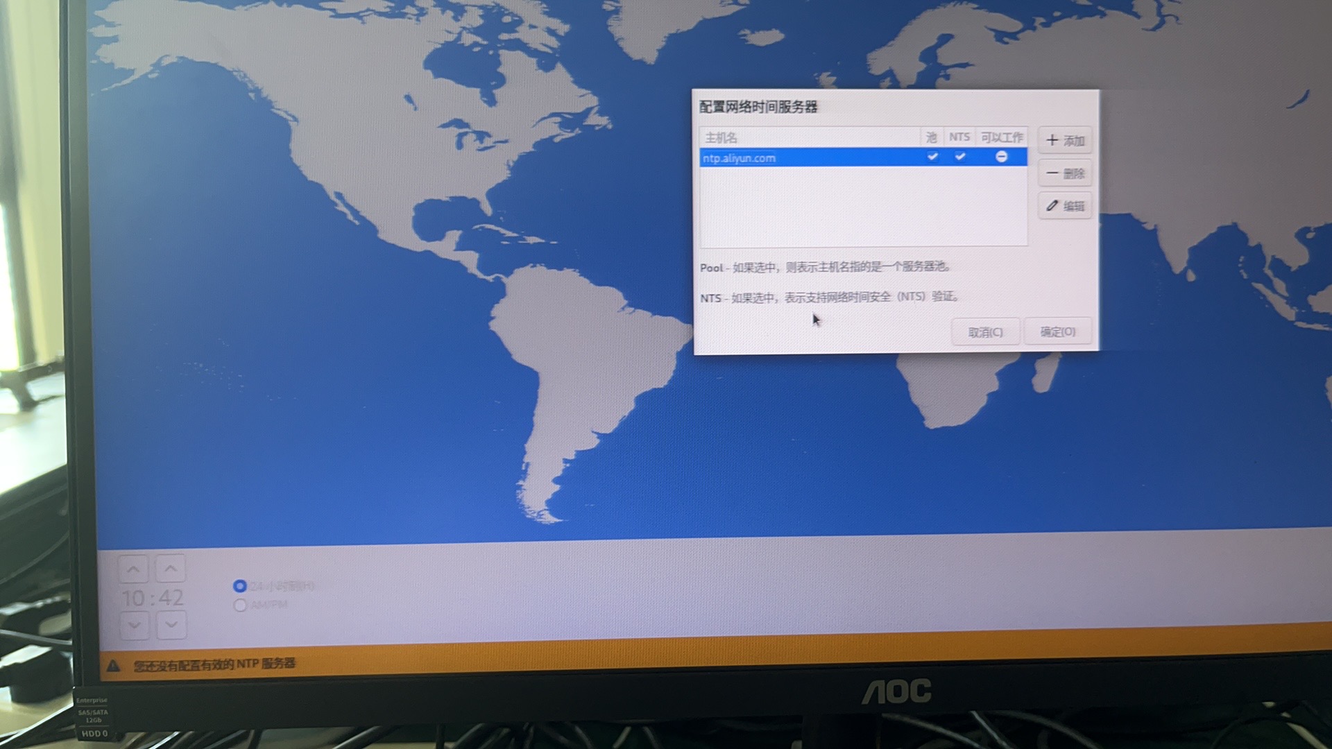 Created attachment 1174 [details] ntp服务配置出错 Description of problem: 在系统安装界面的时间和日期模块中,ntp服务配置后仍显示还没有配置有效的ntp服务器 Version-Release number of selected component (if applicable): Version-Release number of selected component (if applicable): #内核版本 # uname -r 6.6.25-2_rc1.1.an23.loongarch64 #系统版本 # cat /etc/os-release NAME="Anolis OS" VERSION="23" ID="anolis" VERSION_ID="23" PLATFORM_ID="platform:an23" PRETTY_NAME="Anolis OS 23" ANSI_COLOR="0;31" HOME_URL="https://openanolis.cn/" BUG_REPORT_URL="https://bugzilla.openanolis.cn/" iso下载: https://build.openanolis.cn/kojifiles/output/nightly/anolis-23-20240513.4/compose/os/loongarch64/iso/anolis-23-loongarch64-dvd1-20240513.4.iso How reproducible:100% Steps to Reproduce: 1.dd刻录U盘启动盘,在系统安装界面选择时间和日期模块 2.打开网络时间按钮,可以看到已有默认的ntp.aliyum.com服务 3.界面仍提示还没有配置有效的ntp服务器 Additional info: