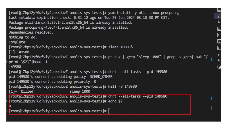 Created attachment 1195 [details] 测试执行结果 [问题描述]: Anolis23环境,chrt --all-tasks --pid ${non-existent PID},显示命令执行成功 [环境信息]: 机器类型:ECS [内核信息]: uname -r 5.10.134-14.1.an23.x86_64 [操作系统信息]: cat /etc/os-release NAME="Anolis OS" VERSION="23" ID="anolis" VERSION_ID="23" PLATFORM_ID="platform:an23" PRETTY_NAME="Anolis OS 23" ANSI_COLOR="0;31" HOME_URL="https://openanolis.cn/" BUG_REPORT_URL="https://bugzilla.openanolis.cn/" [重现步骤]: 前置条件: - 执行命令sleep 1000 &,创建一个进程 - 执行ps aux | grep "sleep 1000" | grep -v grep| awk "{print \$2}"|head -1,获取该进程的pid 测试步骤: - 执行chrt --all-tasks --pid PID,PID为前置条件传入 - 执行kill -9 PID,PID为前置条件传入 - 执行chrt --all-tasks --pid PID,PID为前置条件传入 期望结果: - 命令执行成功,输出该进程的调度策略和优先级 - 命令执行成功,杀死该进程 - 命令执行失败,报cannot obtain the list of tasks错 执行结果: - 测试步骤三中执行chrt --all-tasks --pid PID命令后,命令显示执行成功,且无任何错误提示